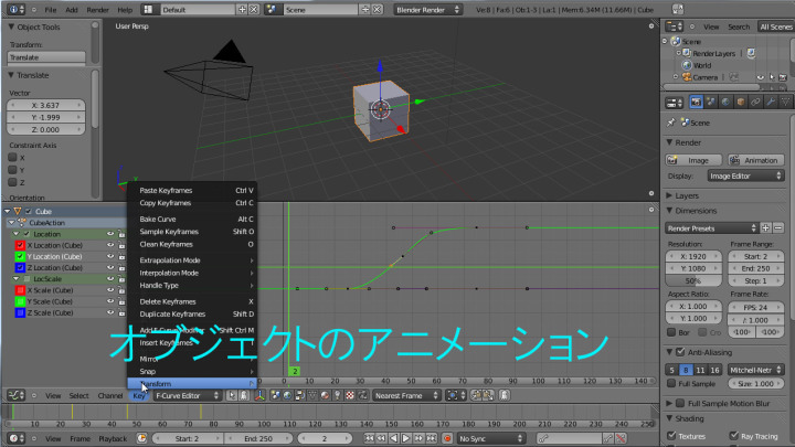 オブジェクトの移動、拡大をアニメーションにするやり方について、キーフレームの作成、タイムラインの操作、グラフエディタ、ドープシートなどについての説明をします。また作成したアニメーションのレンダリングとムービーファイルの作成についても説明します。