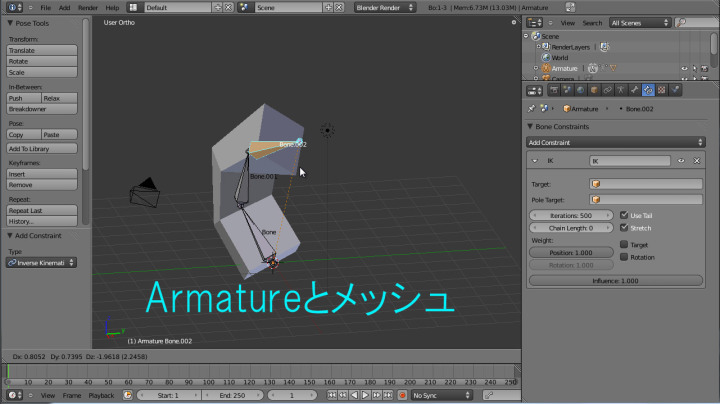 メッシュオブジェクトにArmature、つまりボーンを組み入れ、メッシュを変形させるやり方ですが、キャラクターアニメーションでは必須の方法です。頂点のウェイトの仕方や組み入れたボーンのFKとIK、つまりインバースキネマティクスの作り方についても説明します。 |