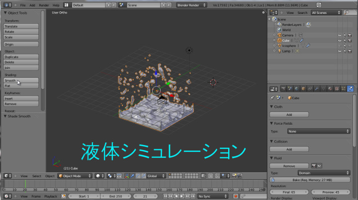 Blrnderの液体シミュレーションは、初期設定の段階では比較的簡単にできます。メッシュオブジェクトを液体オブジェクトとドメインオブジェクトに設定し、物理計算をさせます。チュートリアルではその設定の方法をわかりやすく説明します。 |