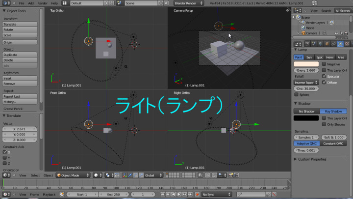 Blenderのライティングについてですが、ポイントライトやスポットライトなど各種の卵黄の簡単な説明、3点によるライティング、ライトのターゲッティングなど基礎的なライティングについての説明や、アンビエントオクルージョン(AO)、アレイオブジェクトによる複数ランプによる証明の仕方などの説明をします。 |
