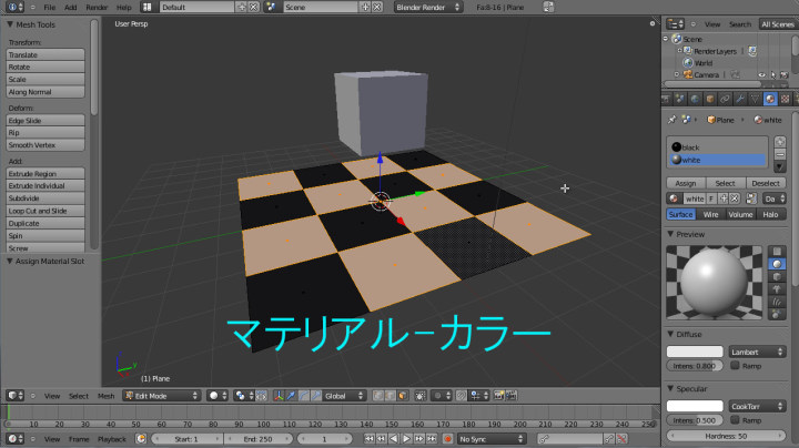 オブジェクトのマテリアルに関する基礎、カラー(diffuse)チャンネルについて、またフェイス(ポリゴン面)のマテリアル割り当てなどについて説明します。 |