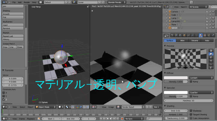 オブジェクトのマテリアルにおけるシェーディング、スペキュラー、透明、屈折や反射などの各チャンネルと、フィルターなどそれらのパラメーターの調節などについて説明をします。 |