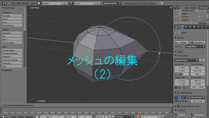 オブジェクトモードと編集モードにおける、移動、回転、拡大縮小の差、頂点ポイント、エッジ、フェイスの選択、また各コンポーネントの複製、押し出し、スライド、リップなどについてなどを説明します。 |