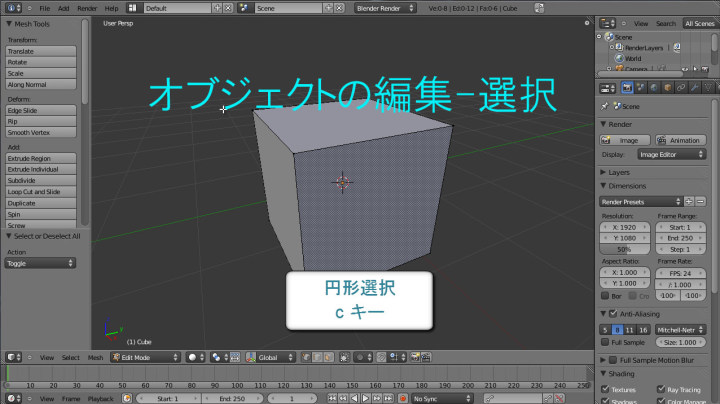 オブジェクトの編集と各コンポーネント(頂点ポイント、エッジ、フェイス)の選択(右クック、ボックス(b)選択、サークル(c)選択など、さらにソリッドモードやワイヤフレームモードにおける複数選択や重複選択などについても説明します。 |