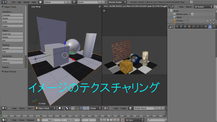 オブジェクトのテクスチャをノードエディタで、たとえばチェッカー模様やレンガのイメージを作る方法を説明し、ノードエディタの入門についてのチュートリアルです。 |
