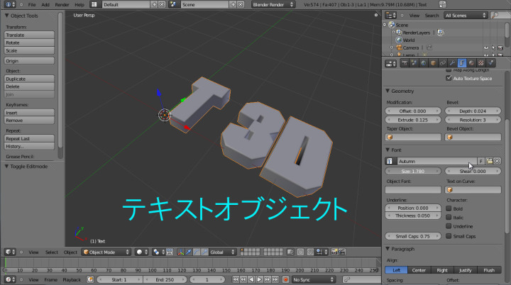 文字-テキストを使って押し出しやベベルによって3Dオブジェクトを作成するやり方を説明します。またそれらのオブジェクトからメッシュに変換することについても説明します。 |